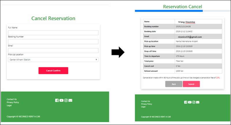 3.Afer the filling up, click [Cancel Confirm] and it would jump to Reservation Cancel page. Click [Submit] and your cancellation will be sent to us. https://api.niconicorentacar.jp/