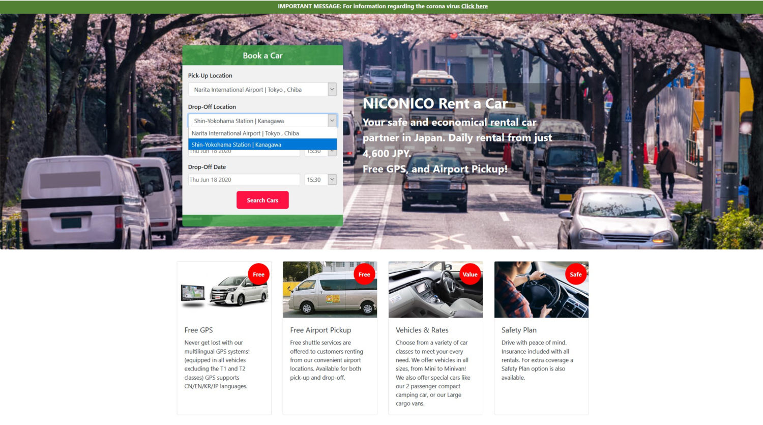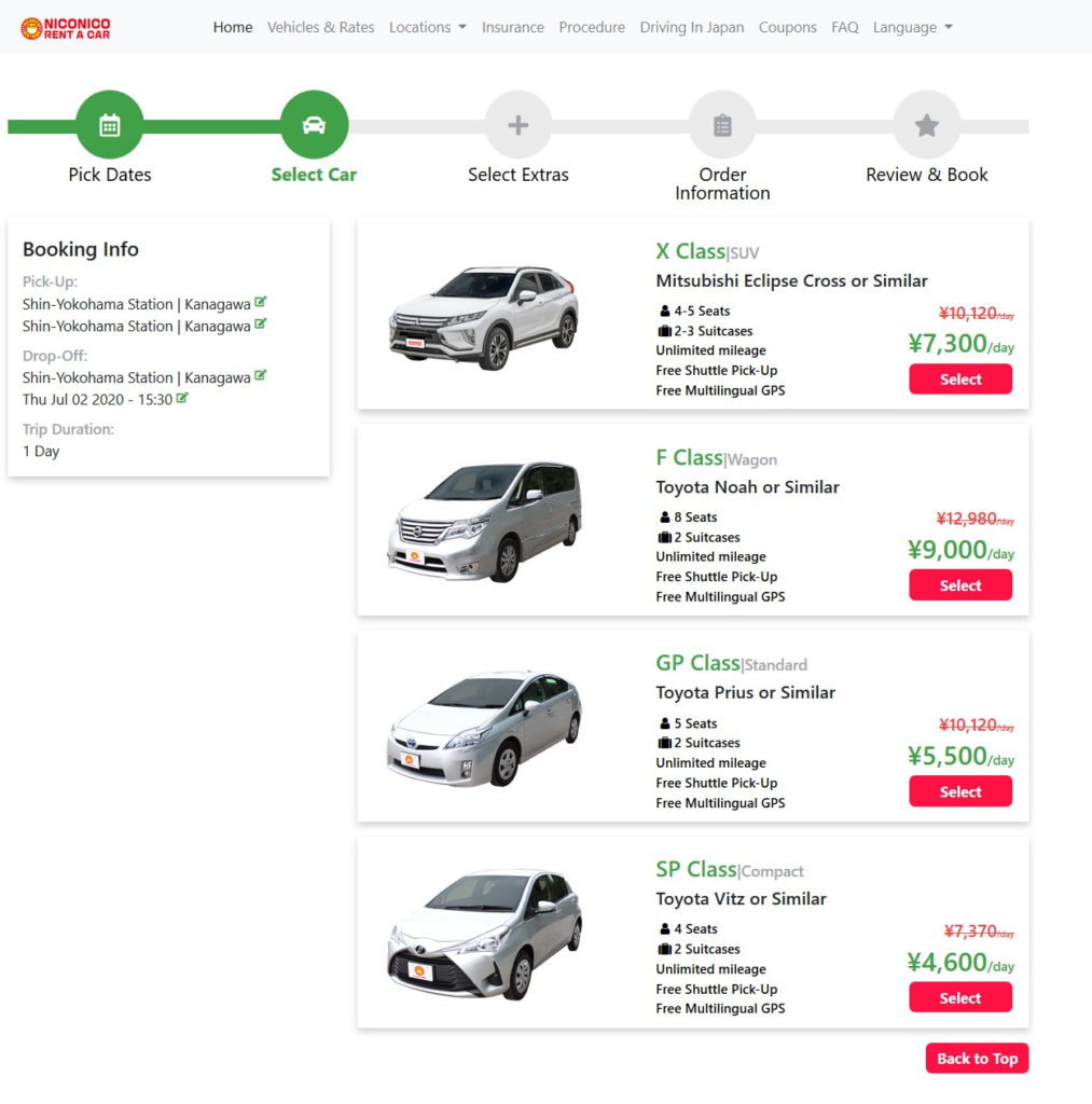 For instance, if you set pick-up location as Narita Airport, drop-off location will show Narita airport and Shin-Yokohama station, that means, it,s possible to pick up car at Narita shop and return at Shin Yokohama shop. But one thing to notice, one way rental takes extra fee (not free).
